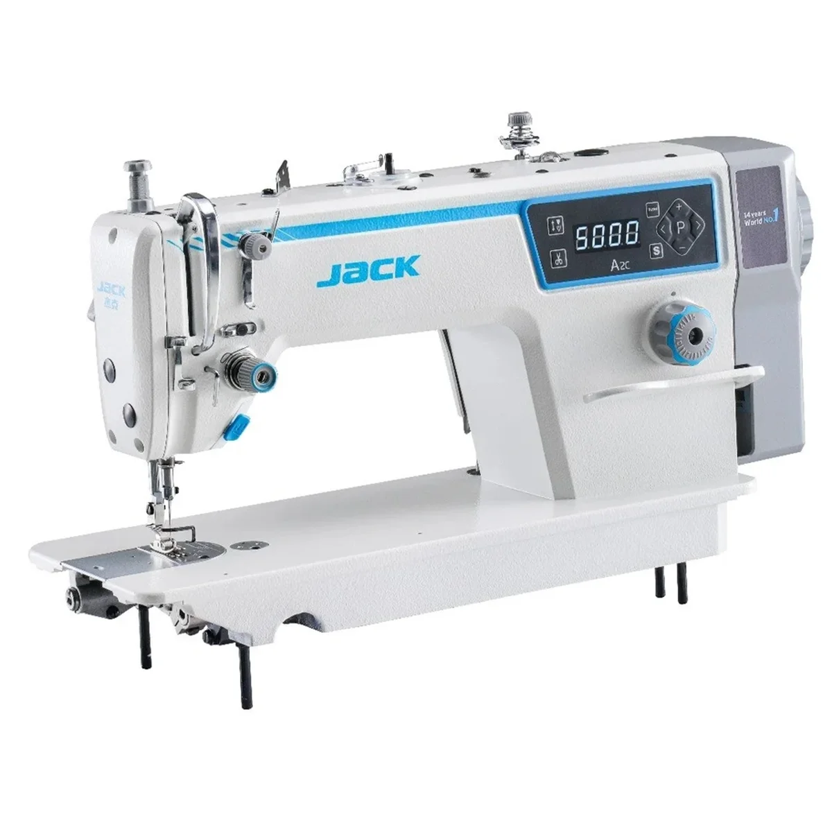 Maquina de costura reta 1 agulha eletrônica Direct Drive designer alemão exclusivo, ponto fixo, com posicionador de agulhas, corte de linhas, posicionador de agulha, caça fio eletromagnético, botão de reset no painel, sistema inteligente de transporte e calcador para costurar tecidos desde super leves até pesados, sistema de cooler na polia para resfriamento, lançadeira chinesa, painel e control box embutido no cabeçote, com sistema de meia pontada, controle de luminosidade da luz de LED com 3 estágios, de 5.000RPM, tamanho do ponto de 5MM, com estante equipada com rodinha.